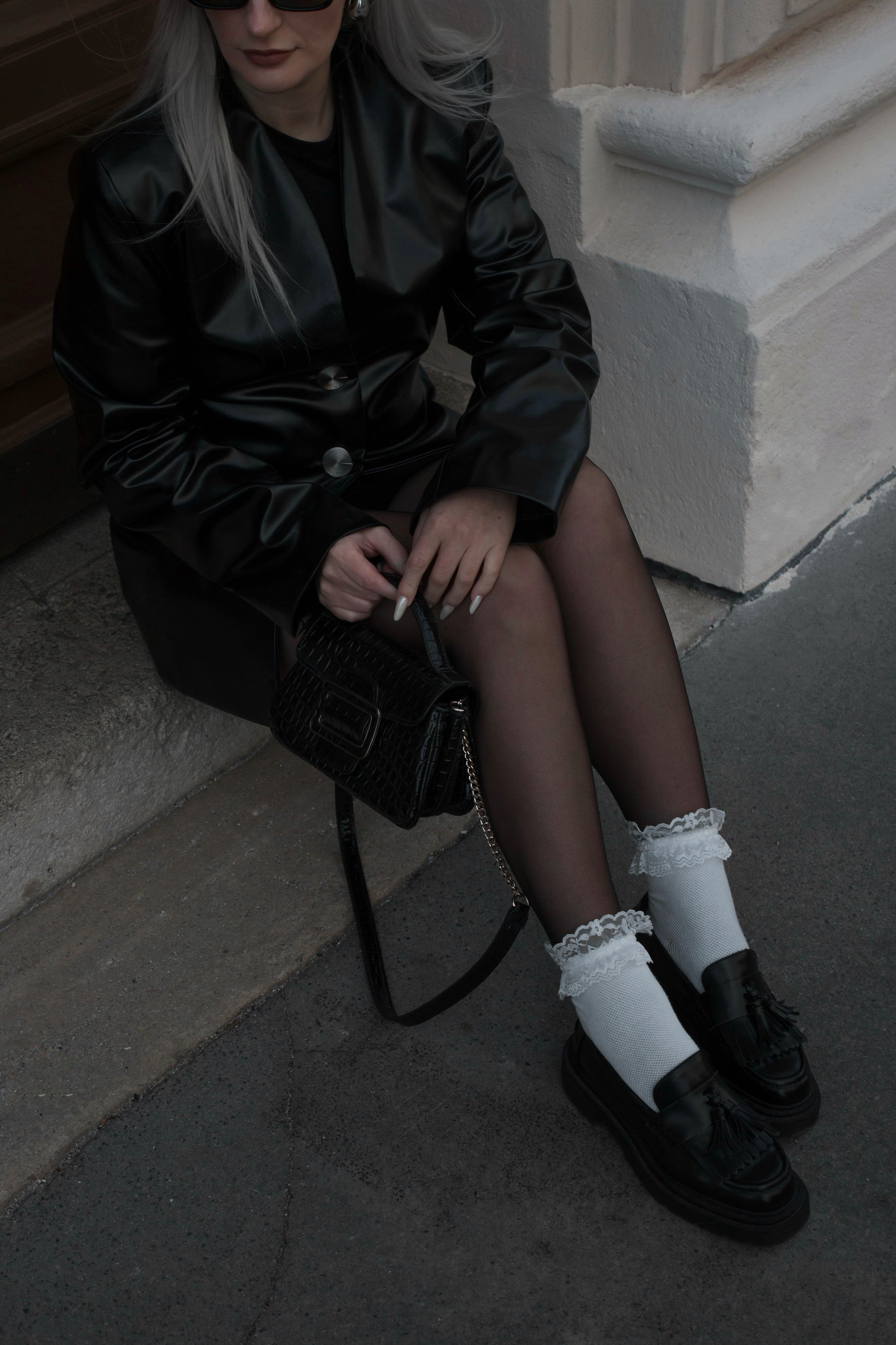 Sako z vegánskej kože so štruktúrovaným strihom, ktorý kopíruje siluetu tela a drží tvar. Materiál je pevný, lesklý a na dotyk pôsobí hladko. Gombíky vytvárajú kontrastný detail a uzatvárajú minimalistický dizajn, ktorý sa ľahko kombinuje s džínsami, sukňou aj nohavicami.