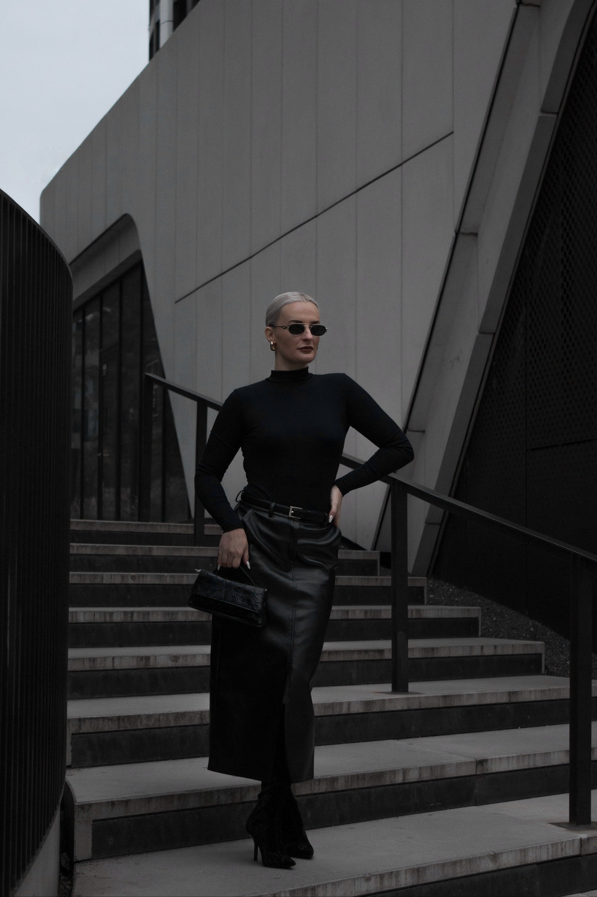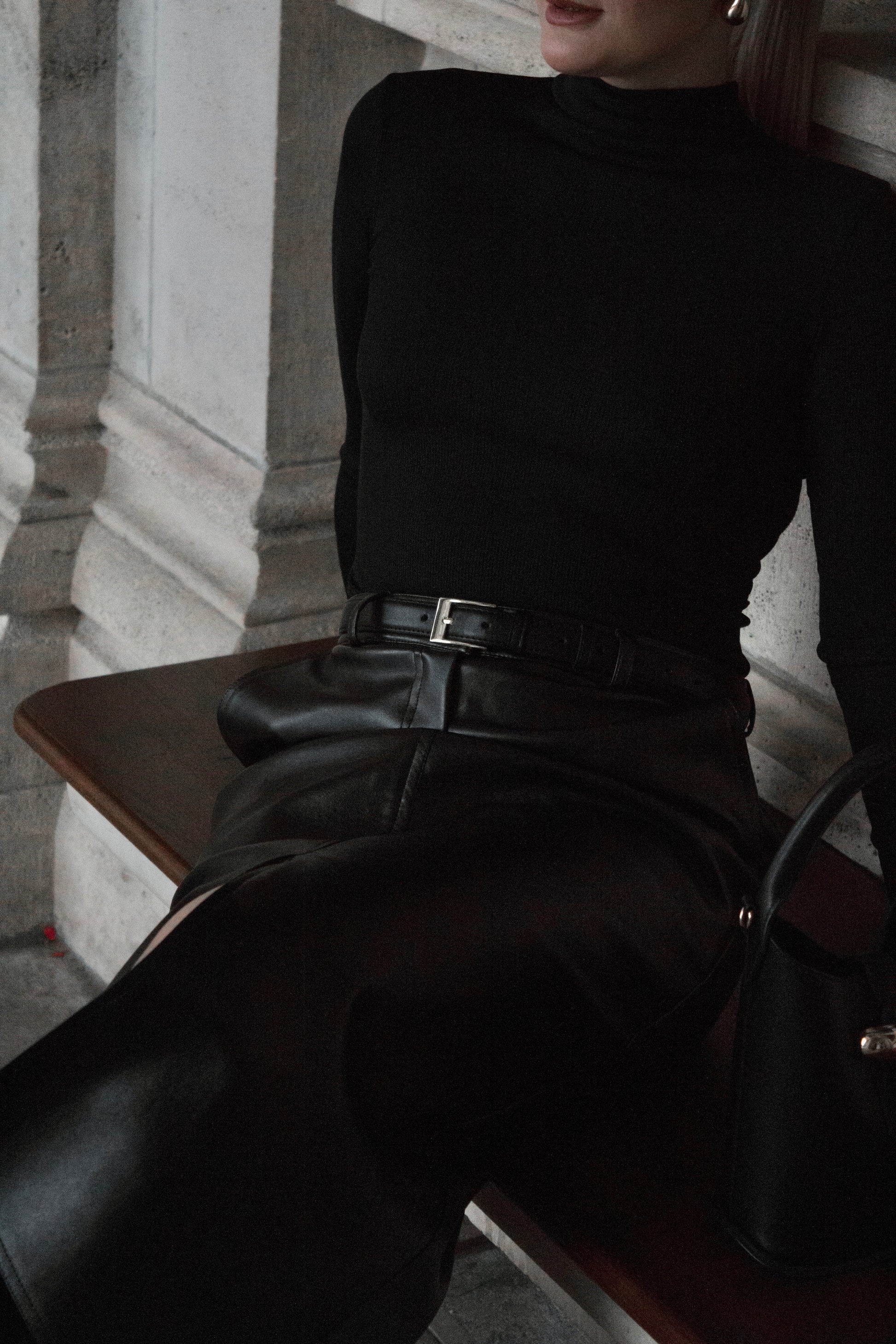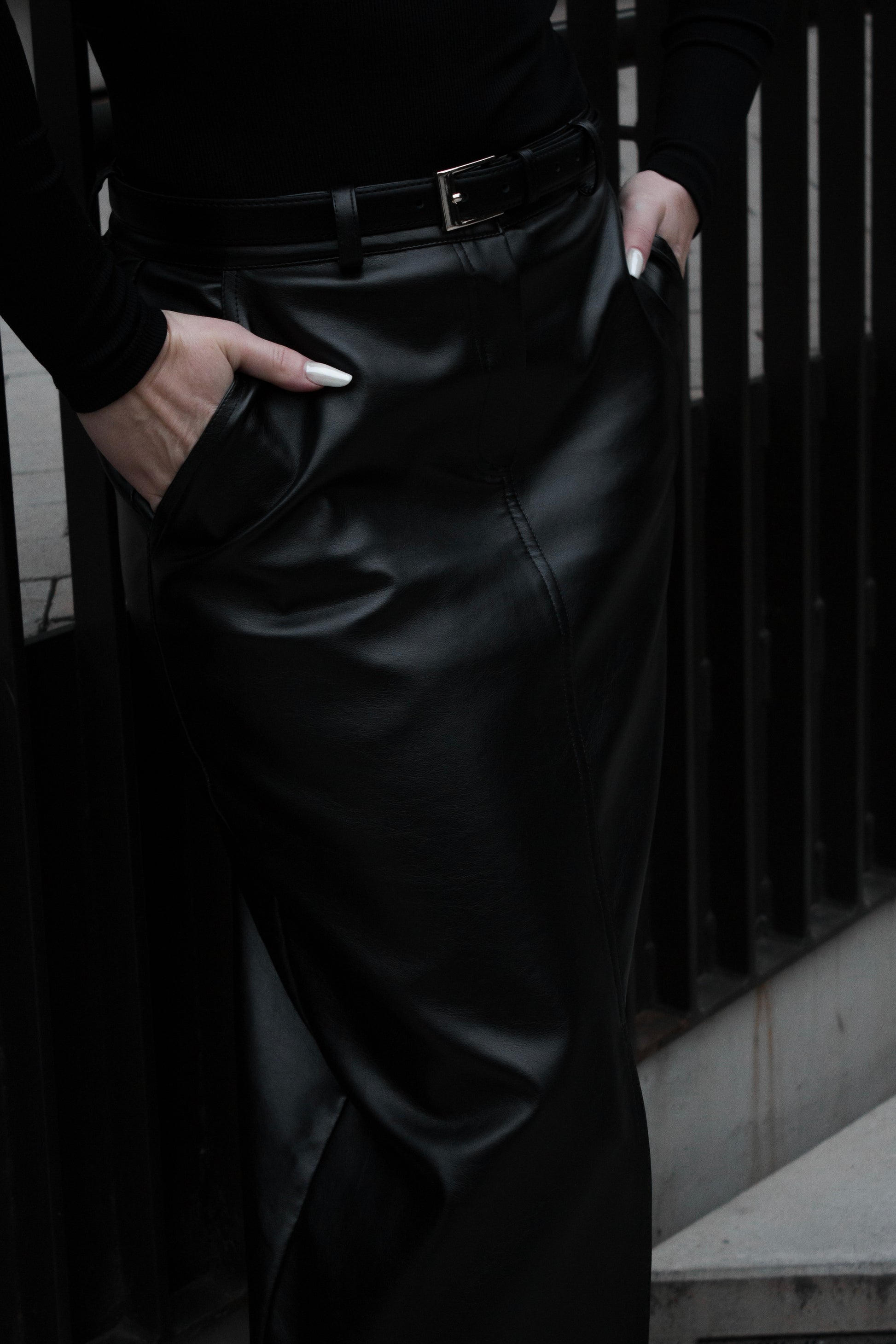 Sukňa z vegánskej kože s precíznym tvarovaním, ktoré zvýrazňuje postavu. Materiál má pevnú, hladkú štruktúru, vďaka ktorej si sukňa udržiava svoj tvar. Predný rázporok umožňuje voľný pohyb a pridáva funkčný detail k čistému, elegantnému vzhľadu. Sukňa sa prispôsobí telu, no nepôsobí obtiahnuto. Ideálna na sezónne vrstvenie s topom, sakom či dlhým kabátom.